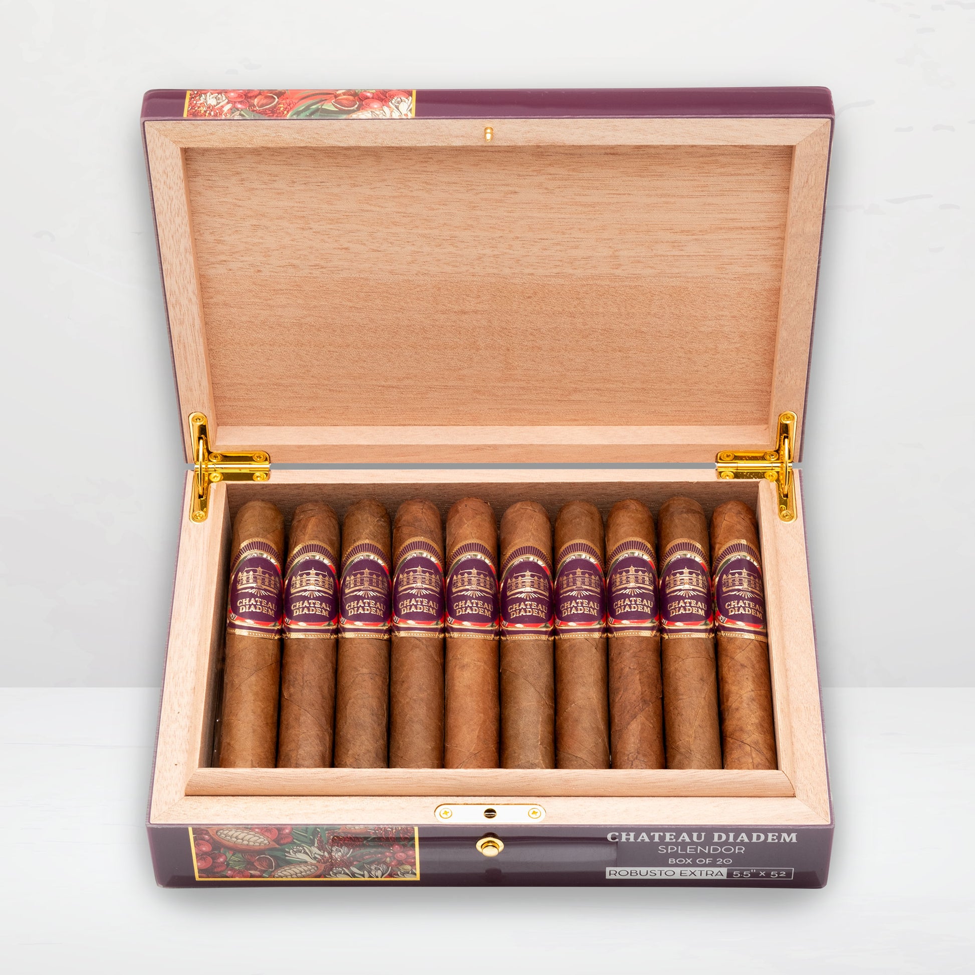 Die Splendor von Chateau Diadem ist das Ergebnis einer begeisterten Begegnung mit dem berühmten Blendmaster Eladio Diaz. Diese Reise durch Geschmack und Tradition kombiniert eine Auswahl von vier dominikanischen Einlageblättern mit einem ecuadorianischen Corojo-Deckblatt und einem mexikanischen San Andres-Deckblatt. Dieser Blend ist nicht einfach nur eine Zigarre, sondern eine Geschichte der Alchemie, in der das Terroir, die sorgfältige Auswahl, die Reifung und die Fermentierung zu einem perfekten Gleichgewicht von Aromen und Geschmack verschmelzen.